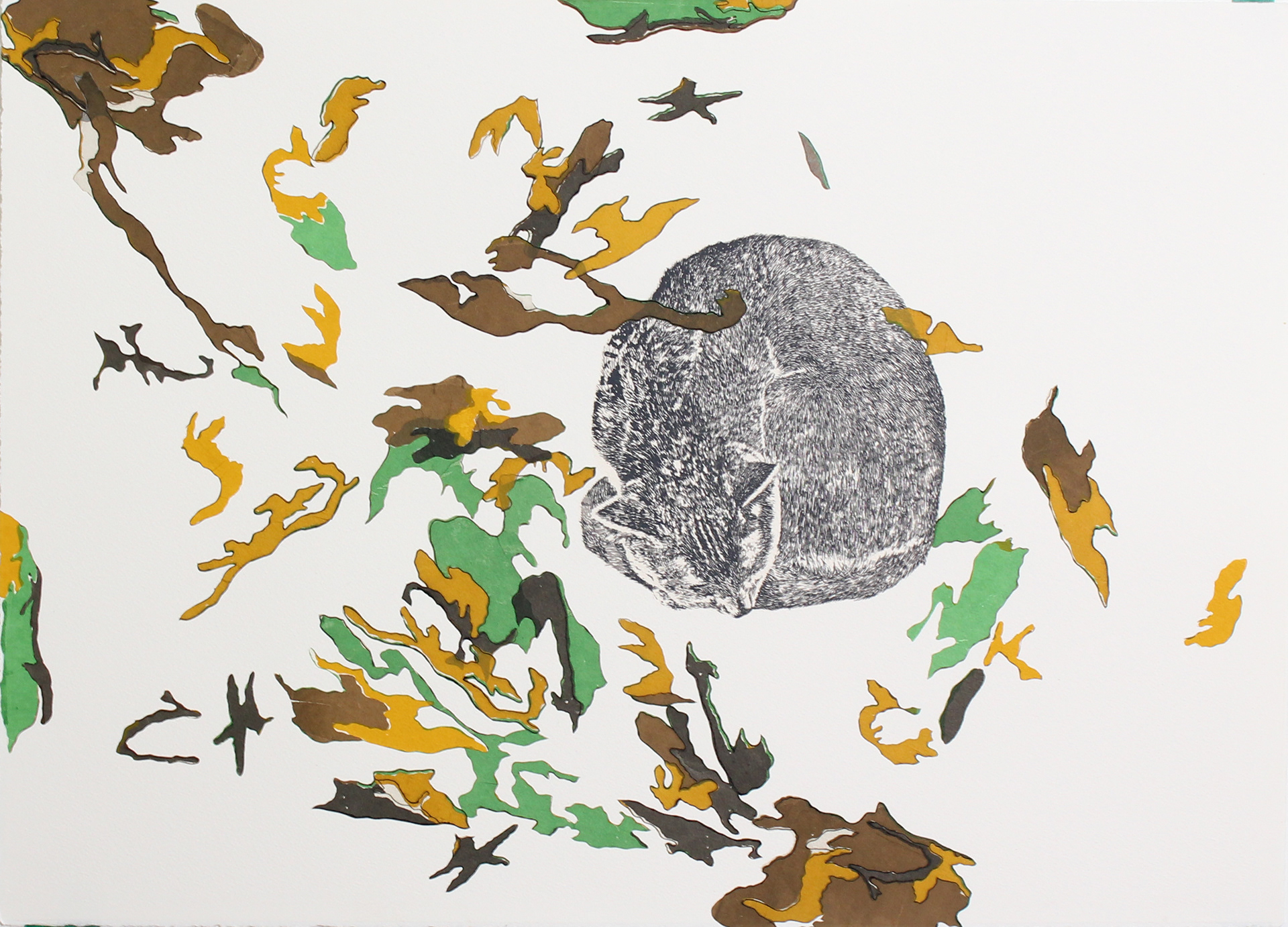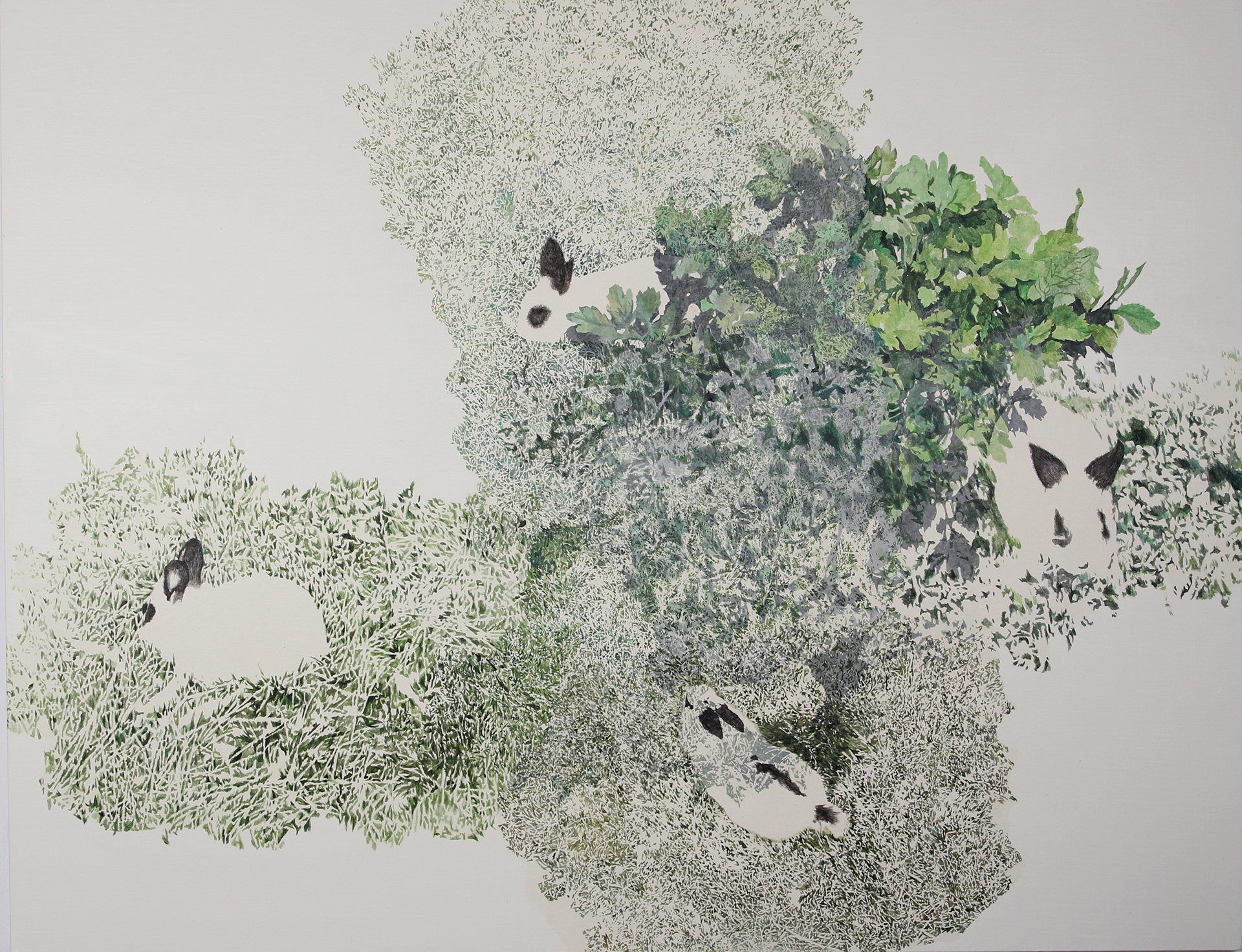 Layered image, a collage work overlapping drawings that were produced one per day over a certain period is an attempt to represent the accumulation of everyday recurrent experience like some ‘indescribable’ abstract character. Each animal and plant image in this work is associated with my personal experience or specific event. For example, in recent work I have repetitively depicted plant roots, zebra patterns, roses, peacocks, bathrobe patterns, and puppies on thin paper in printmaking and drawing. These images serve as my personal metaphor reflecting my momentary thoughts and experiences for one year. As these drawings repetitively overlap, each individual meaning is concealed, and become like abstract dots, lines, and planes, rather than making me feel these are accumulations of work habitually done every day.